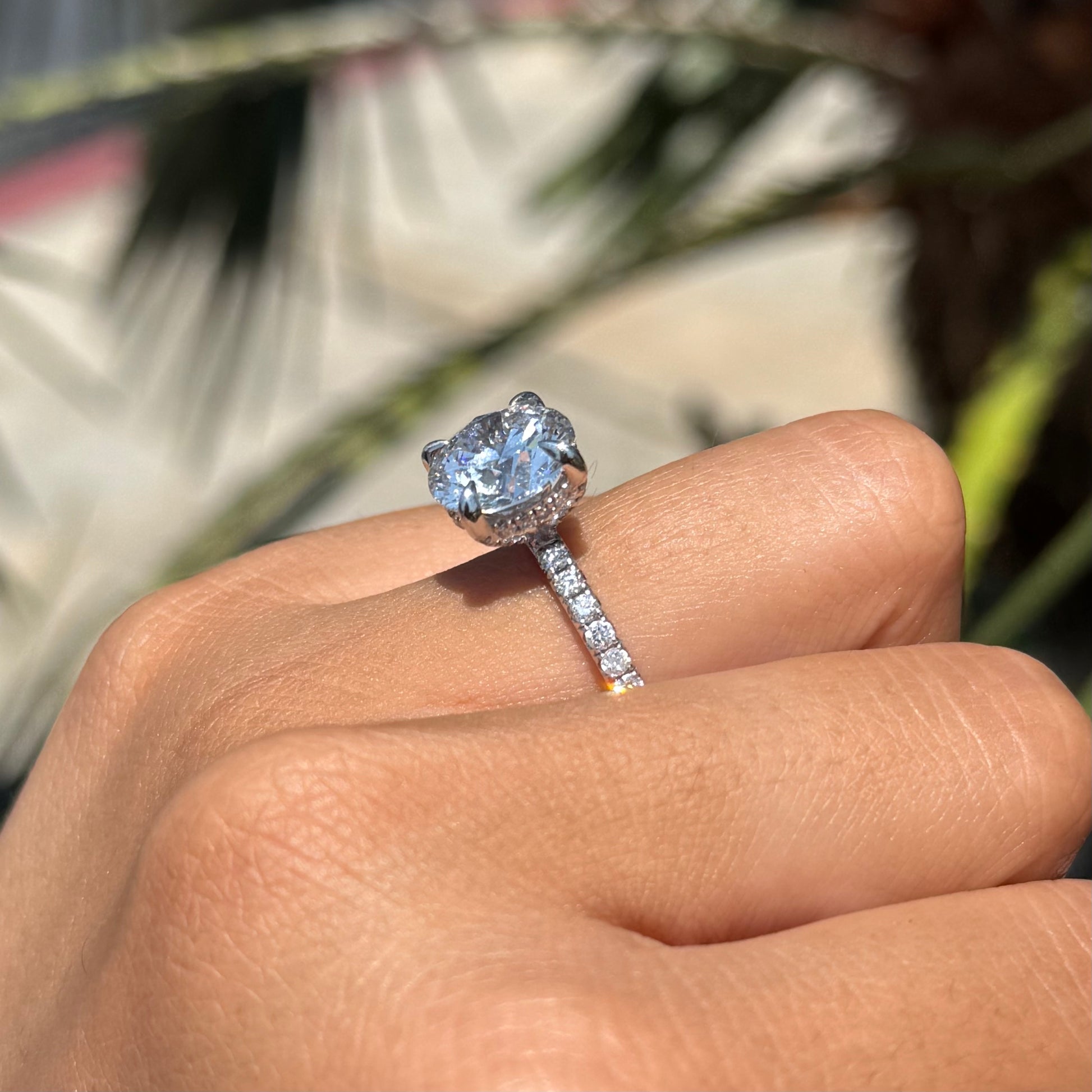 This eternity prong setting engagement ring features a 3.80 carat lab grown round-cut diamond at its center, with a hidden halo to support. A classic piece of art to symbolize your love.