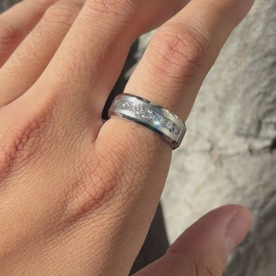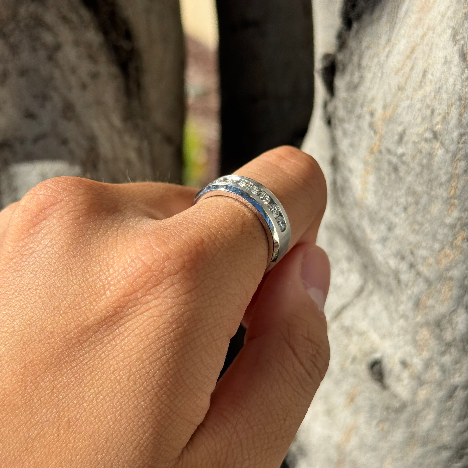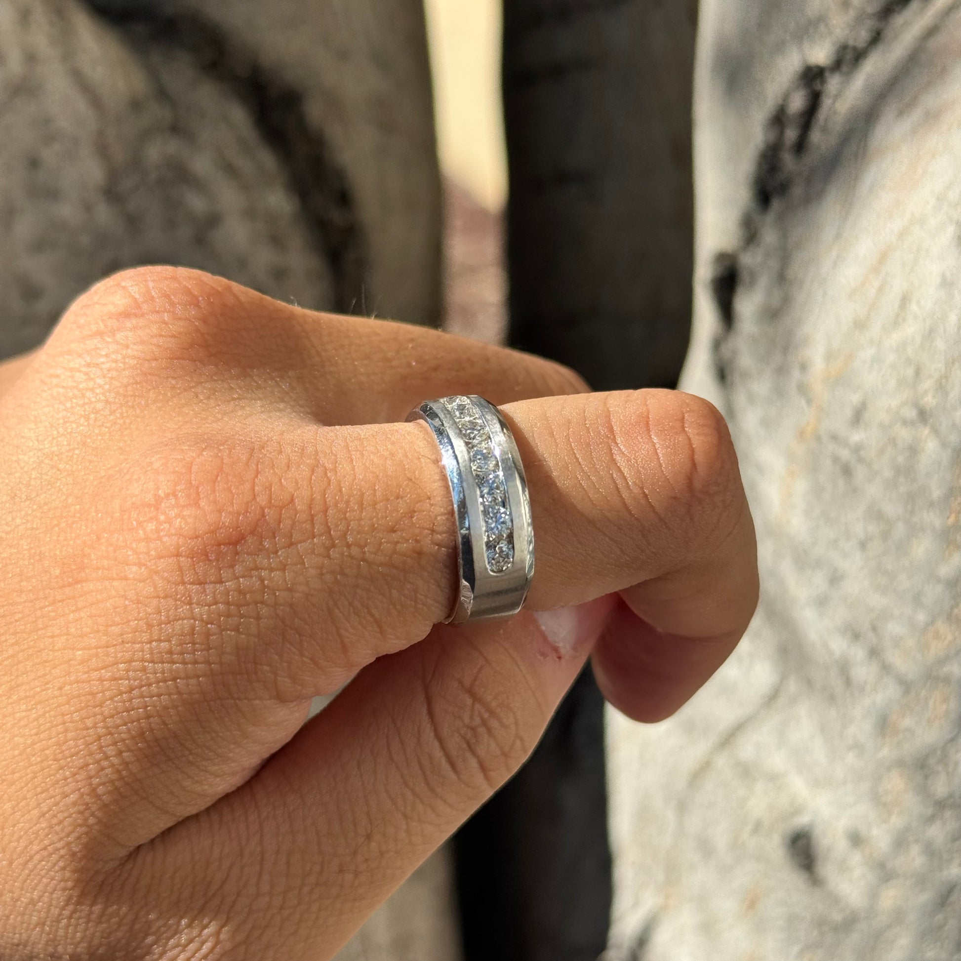 Matte and polished band, with a diamond channel setting to catch the eye.