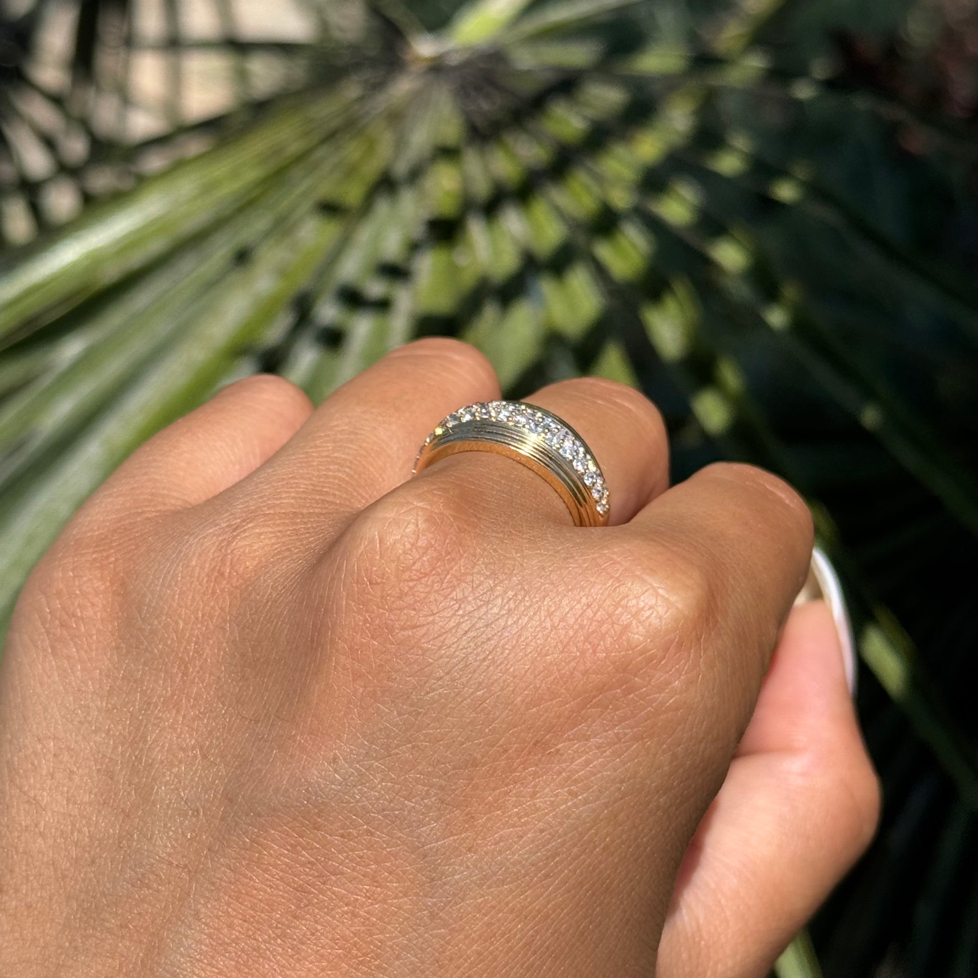14k across the band, and a ribbed design weaving across an eye catching diamond pavé setting. All 38 natural round-cut diamonds set in beautifully.