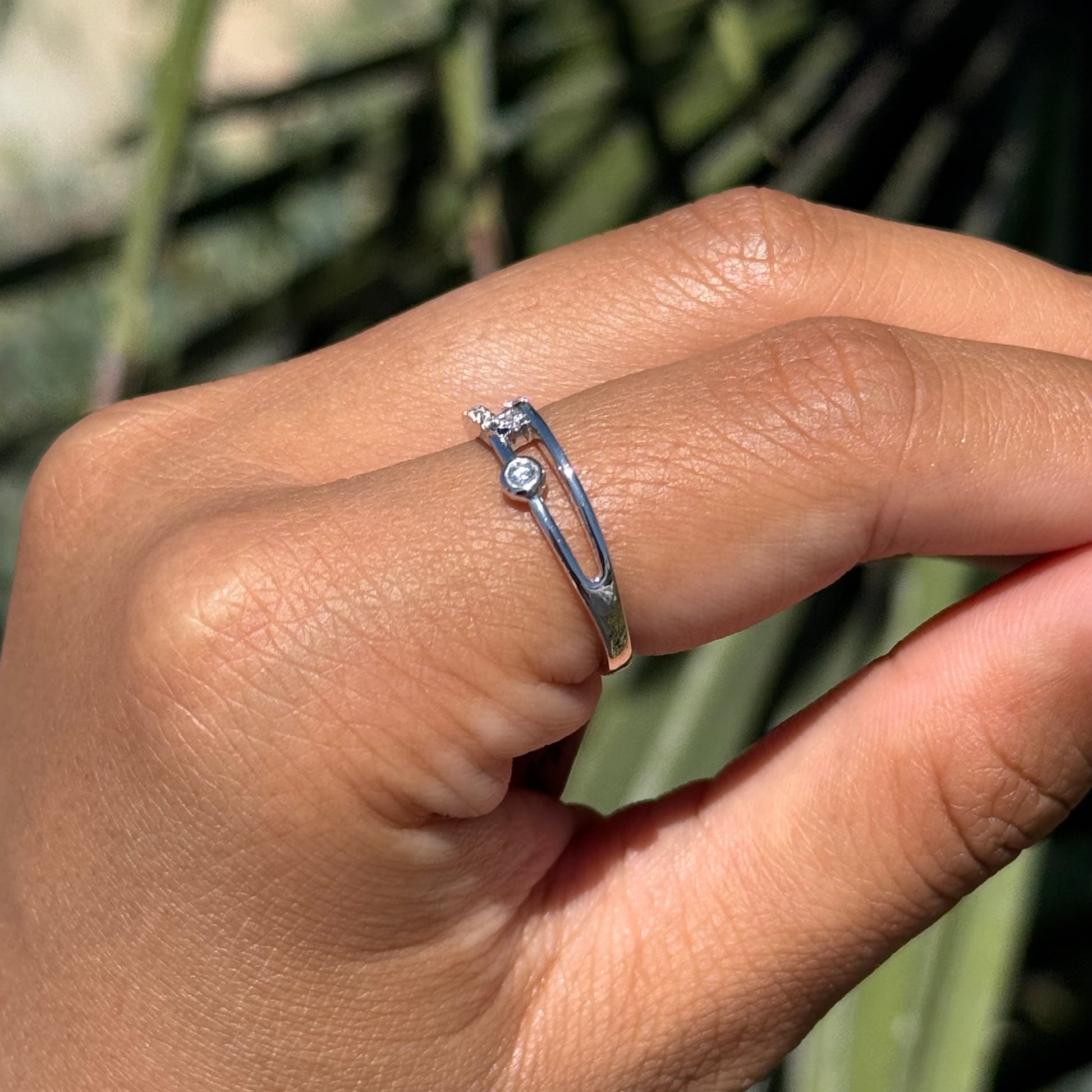 Two row gold band, linked similary to a chain link. Diamonds perfectly set on one end and a round bezel on the other, for a total of 21 round-cut diamonds.