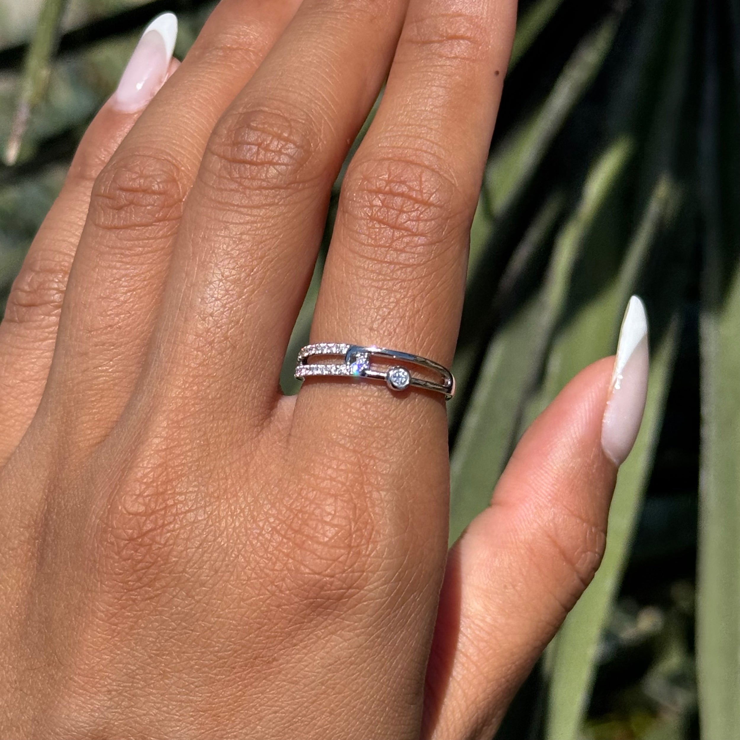 Two row gold band, linked similary to a chain link. Diamonds perfectly set on one end and a round bezel on the other, for a total of 21 round-cut diamonds.
